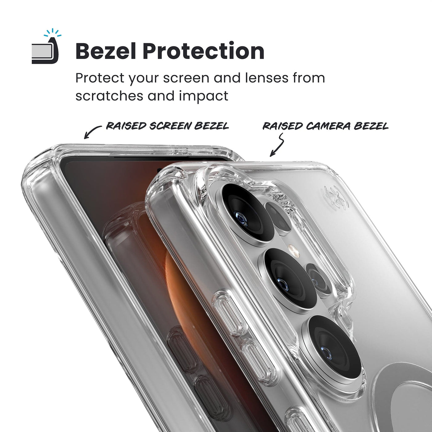 Plus, it also features our raised bezel. This added edge helps protect your screen from scratches, chips, or the dreaded spiderweb shatter if your phone falls and lands face-down.