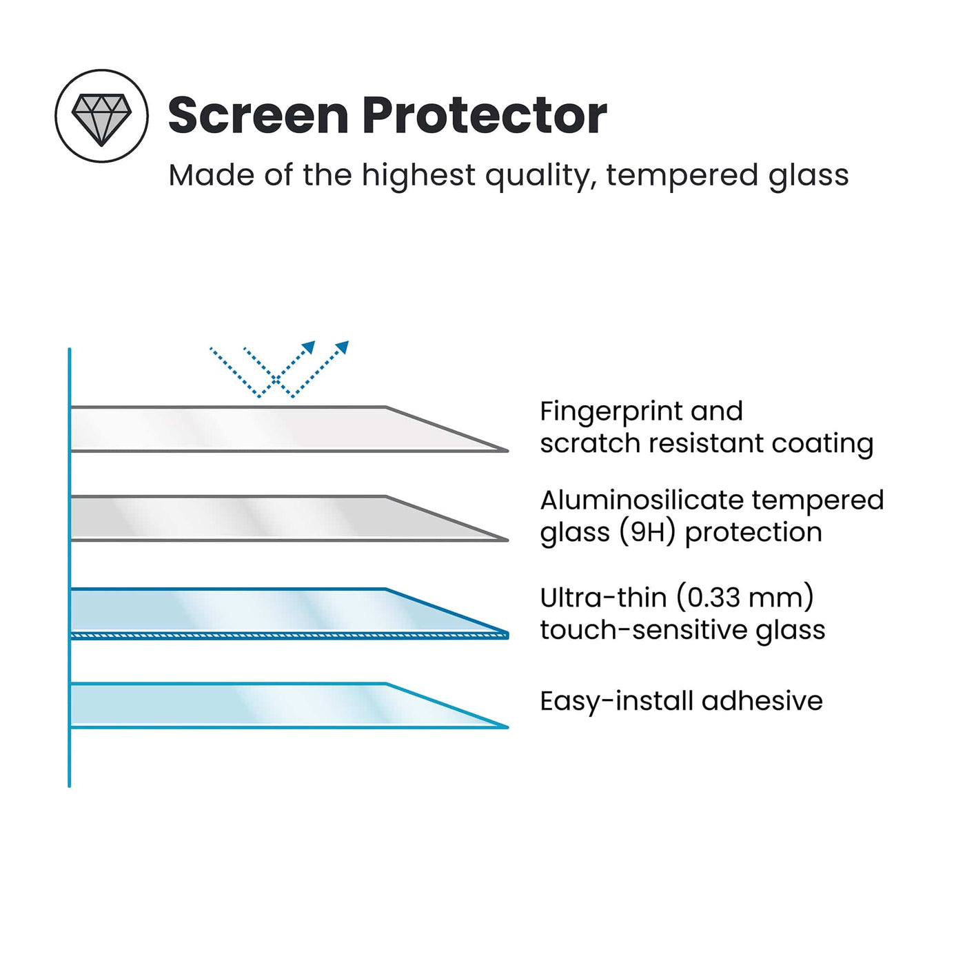 Illustration of layers of ShieldView Glass - ShieldView Glass: made of the highest quality, tempered glass; Fingerprint and scratch resistant coating; Aluminosilicate tempered glass (9H) protection; Ultra-thin (0.33mm) touch-sensitive glass; Easy-install adhesive