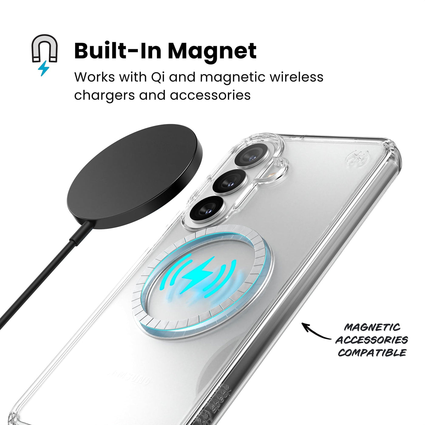 A magnetic charger hovers over the back of the phone case. Text reads Built-In Magnet: Works with Qi and magnetic wireless chargers and accessories