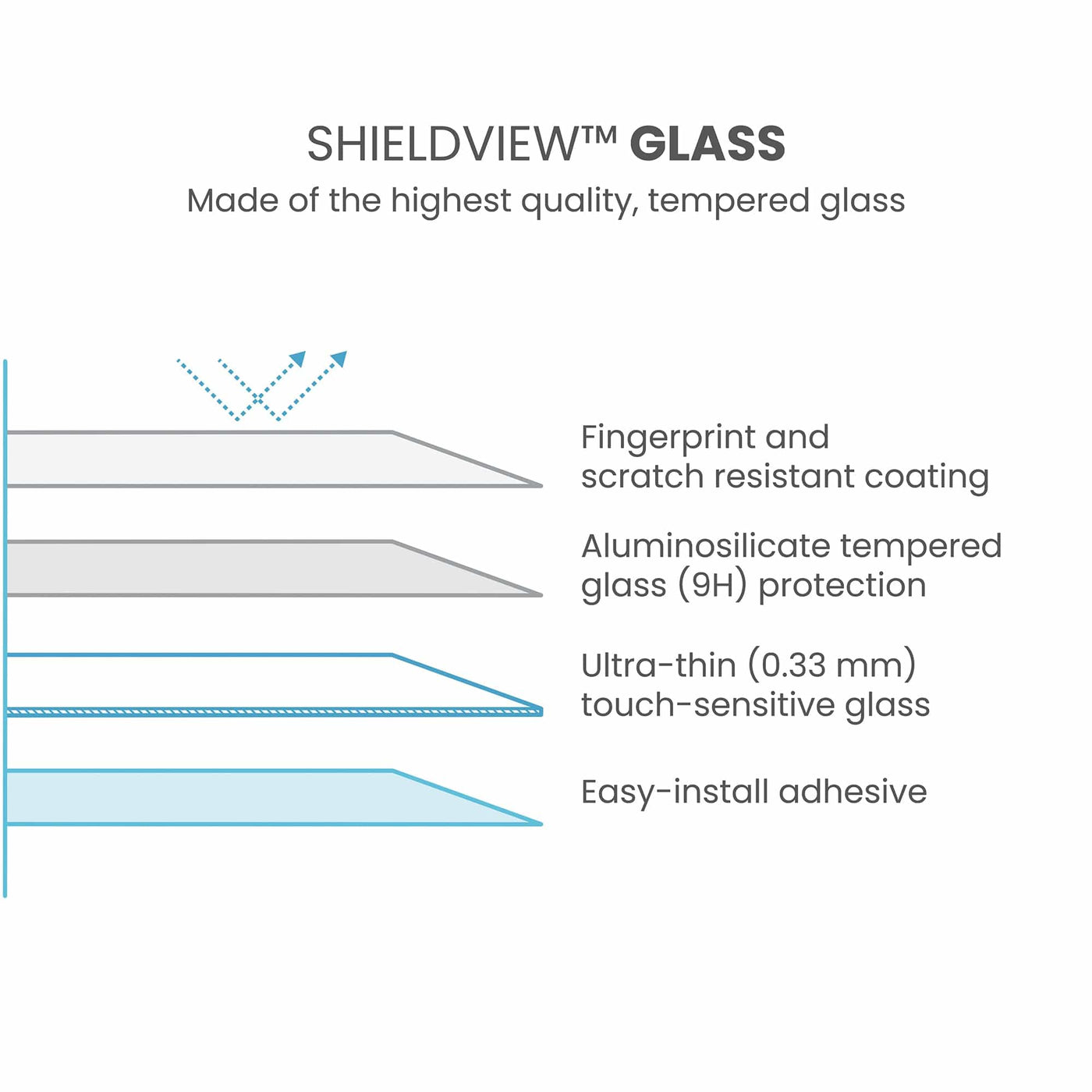 Layers of ShieldView Glass - Fingerprint and scratch resistant coating; Aluminosilicate tempered glass (9H) protection; Ultra-thin (0.33mm) touch-sensitive glass; Easy-install adhesive