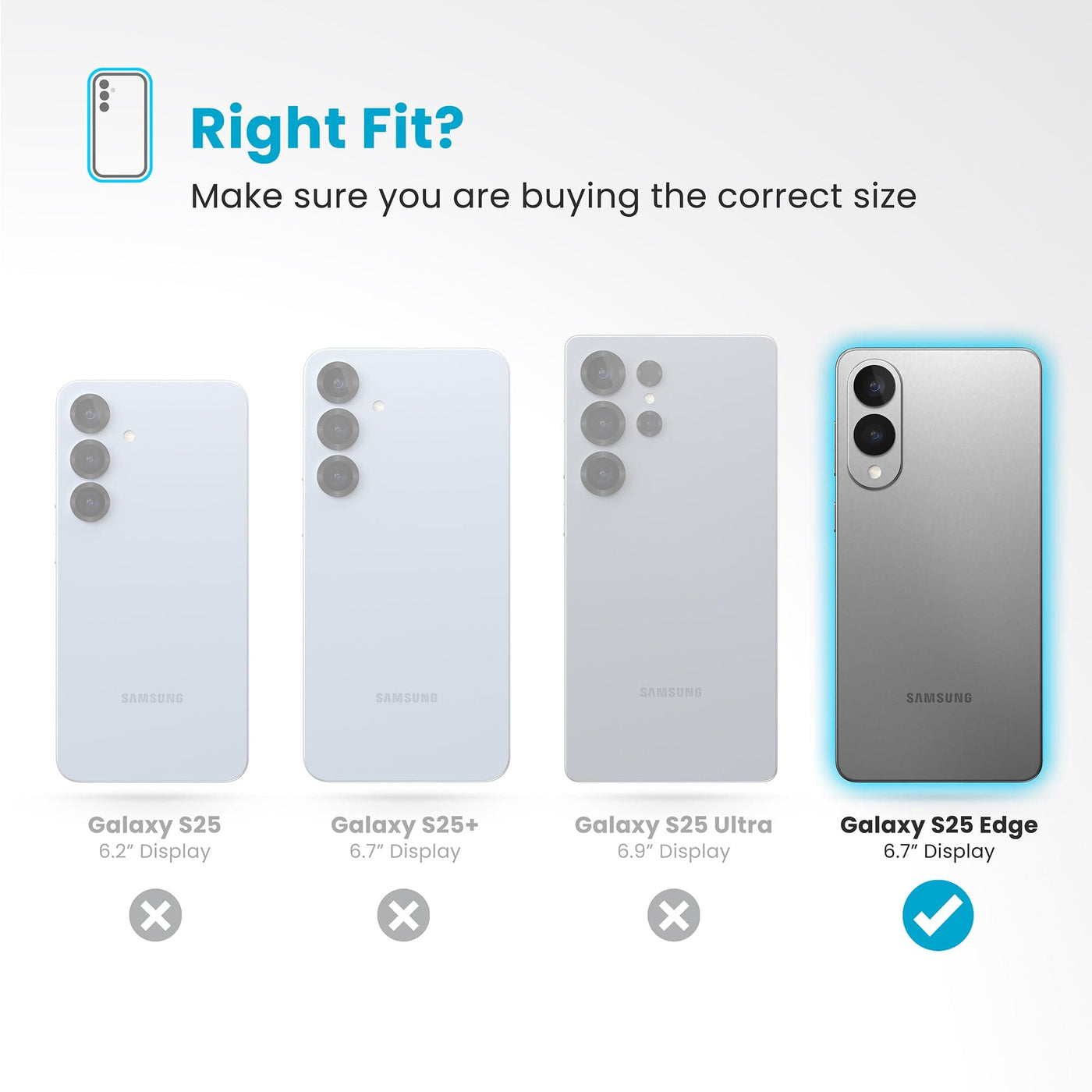 All four phones are shown - Galaxy S25 Edge is highlighted. Text reads Right fit? Make sure you are buying the correct size